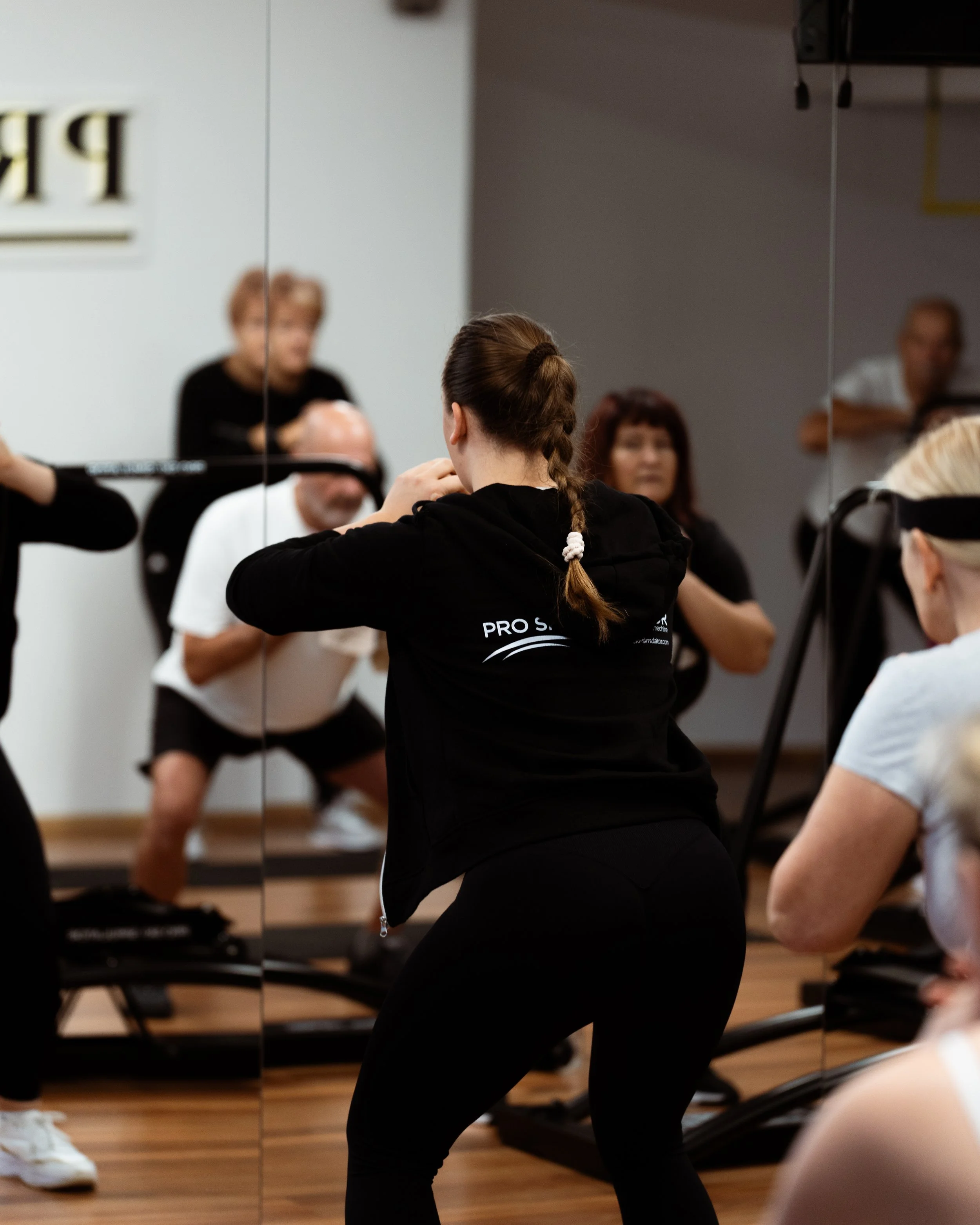 Your 4-session membership gives you access to our boutique small-group classes — a balanced blend of Pro Ski legs, dumbbell strength, core, and a mobility finish.